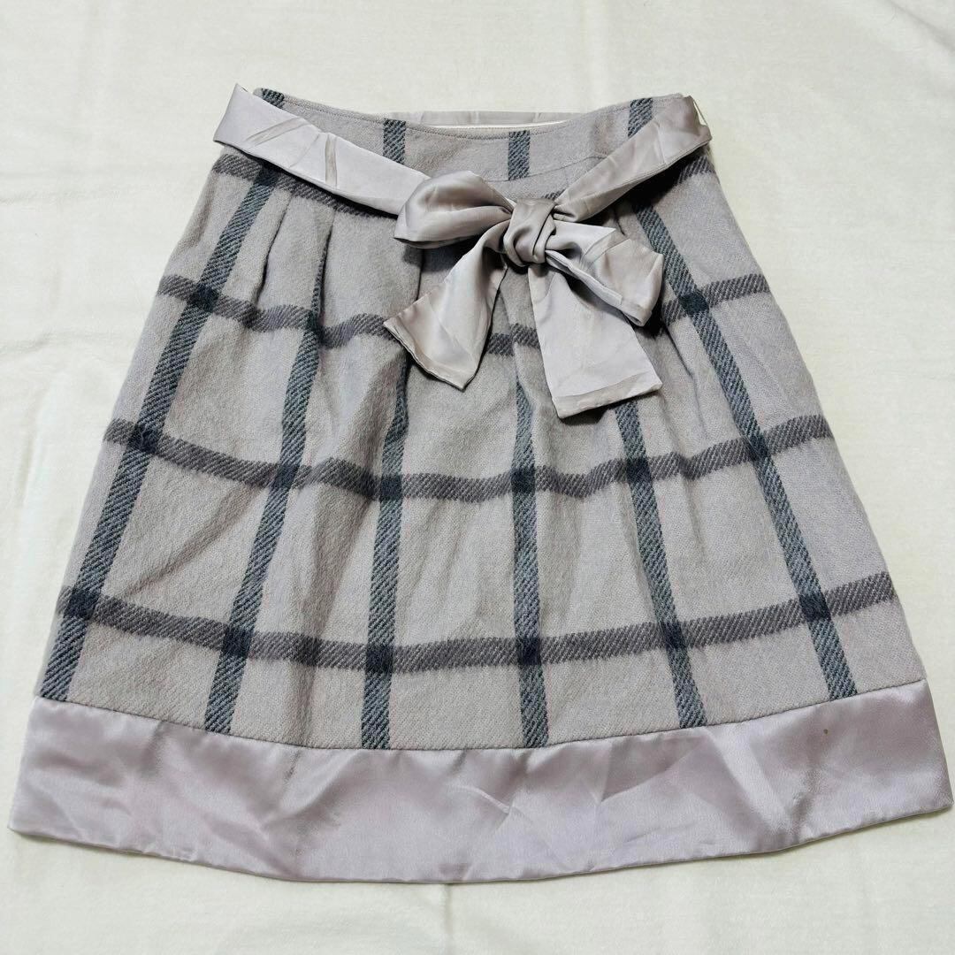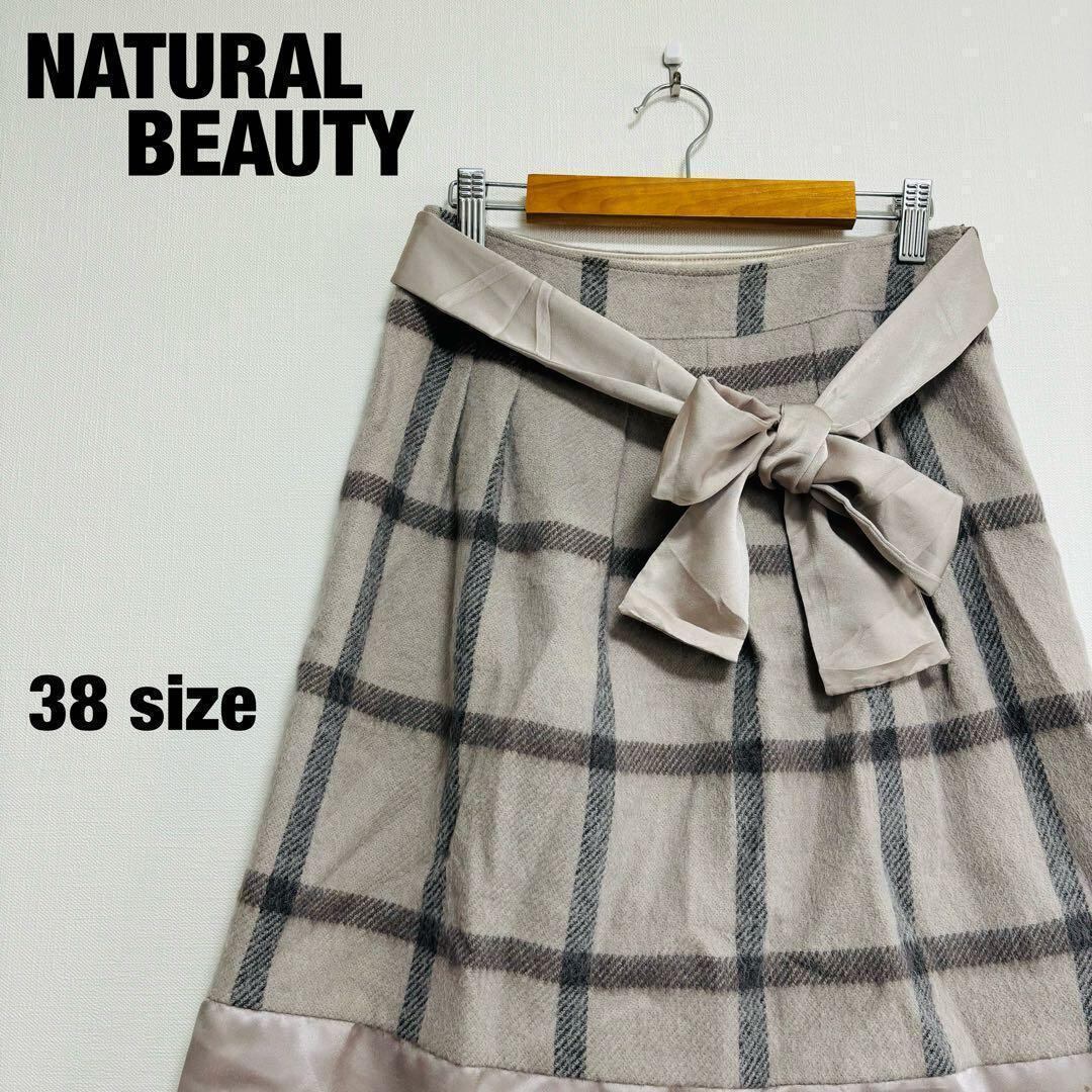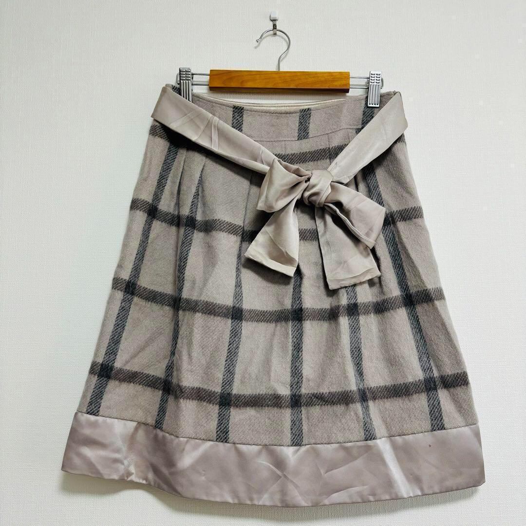 ナチュラルビューティー ひざ丈スカート 台形 リボン チェック L フレア